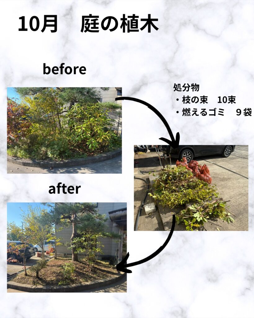 今回の処分物は、3ヶ月の中では10月の枝の束とゴミ袋が一番多かったです。