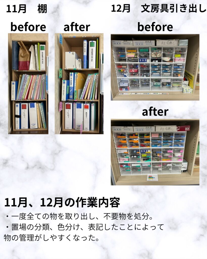 11月と12月は主に色分けや表記を行い、物の管理をしやすくなりました!