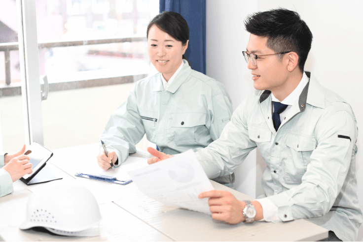 元々、⼈を⼤切にする企業⾵⼟がありますので安全第⼀でベストな体調でしっかり仕事に取り組んでいただくために基本は1社員は掛け持ちなしの1現場しか担当できません。それに加えてほぼ定時での退社、休憩・休⽇の取得の徹底を⾏なっております。
